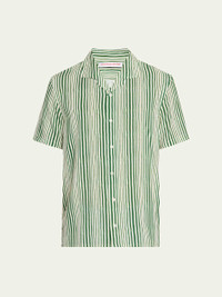 Orlebar Brown camp shirt in lyocell showcasing an exclusive shore stripe print Notch collar Concealed button placket Pearlescent buttons Short sleeves Back yoke Straight hem Relaxed fit Lyocell Made in Portugal Online Inquiries: BGS21_NDG2J| Store Inquiries: #5037066