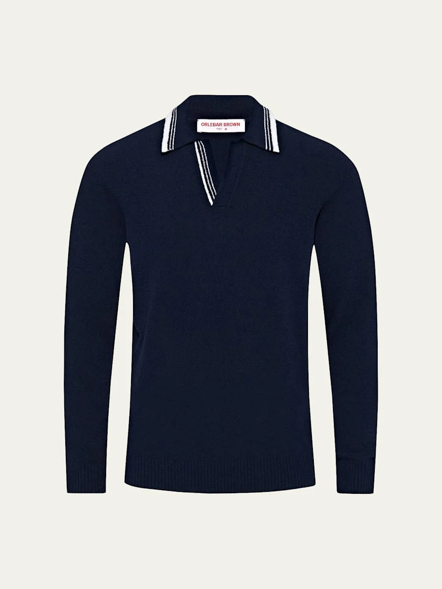 Orlebar Brown "Horton" boucle polo shirt with striped trim Open collar Long sleeves Relaxed fit Pullover style Cotton/nylon/polyamide Cool handwash or professional dry clean Made in Italy Model is 6'1"/185cm. Online Inquiries: BGS21_NCJDW| Store Inquiries: #4892022