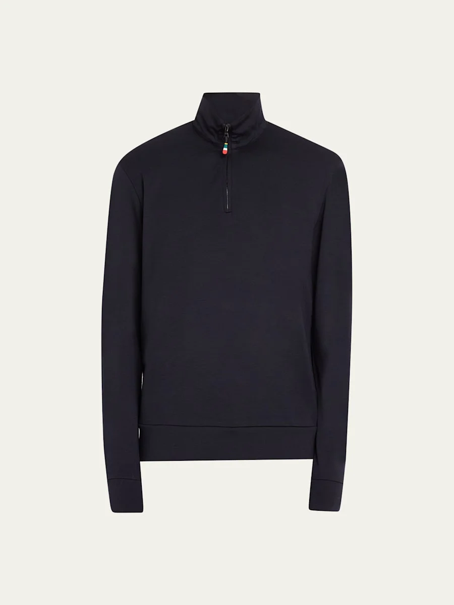 Orlebar Brown "Isar" solid sweatshirt with signature stripe detail Stand collar Quarterzip placket Long sleeves Banded cuffs and hem Merino wool Machine wash cold Made in Portugal