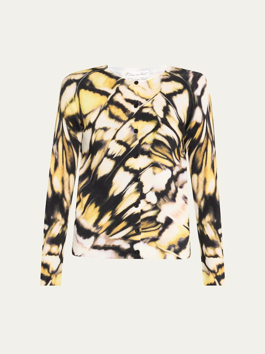 Oscar de la Renta knit cardigan featuring a butterfly print Crew neckline; button front Long sleeves Slim fit Ribbed cuffs and hem Button closure Cotton/viscose Unlined Lining: Silk Dry clean Made in Italy Online Inquiries: BGS21_B9XER| Store Inquiries: #4993474