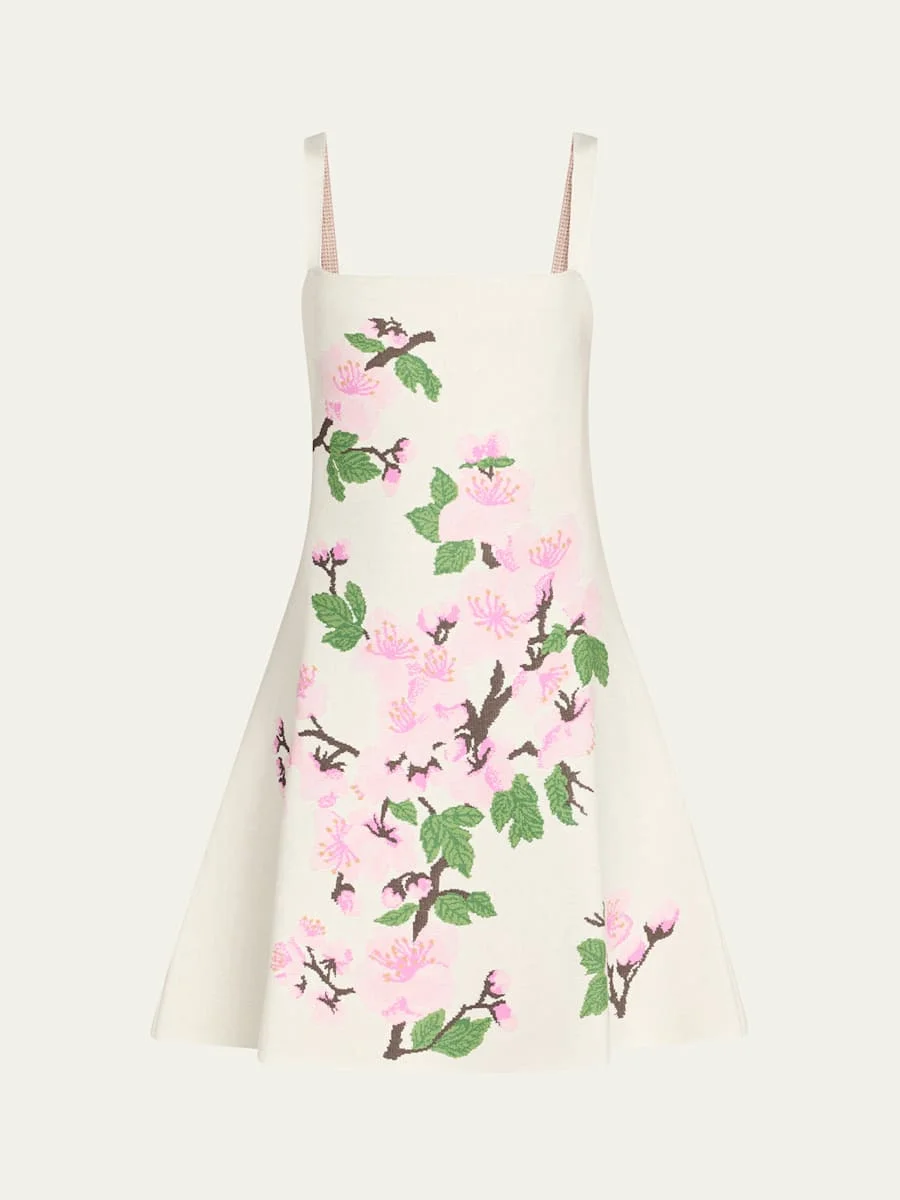 Oscar de la Renta knit dress featuring a cherry blossom intarsia Square neckline Sleeveless Fit-and-flare silhouette Mid thigh length Side zip Viscose/polyester/nylon/polyamide Unlined Dry clean Made in Italy Online Inquiries: BGS21_B9XFC| Store Inquiries: #4993495
