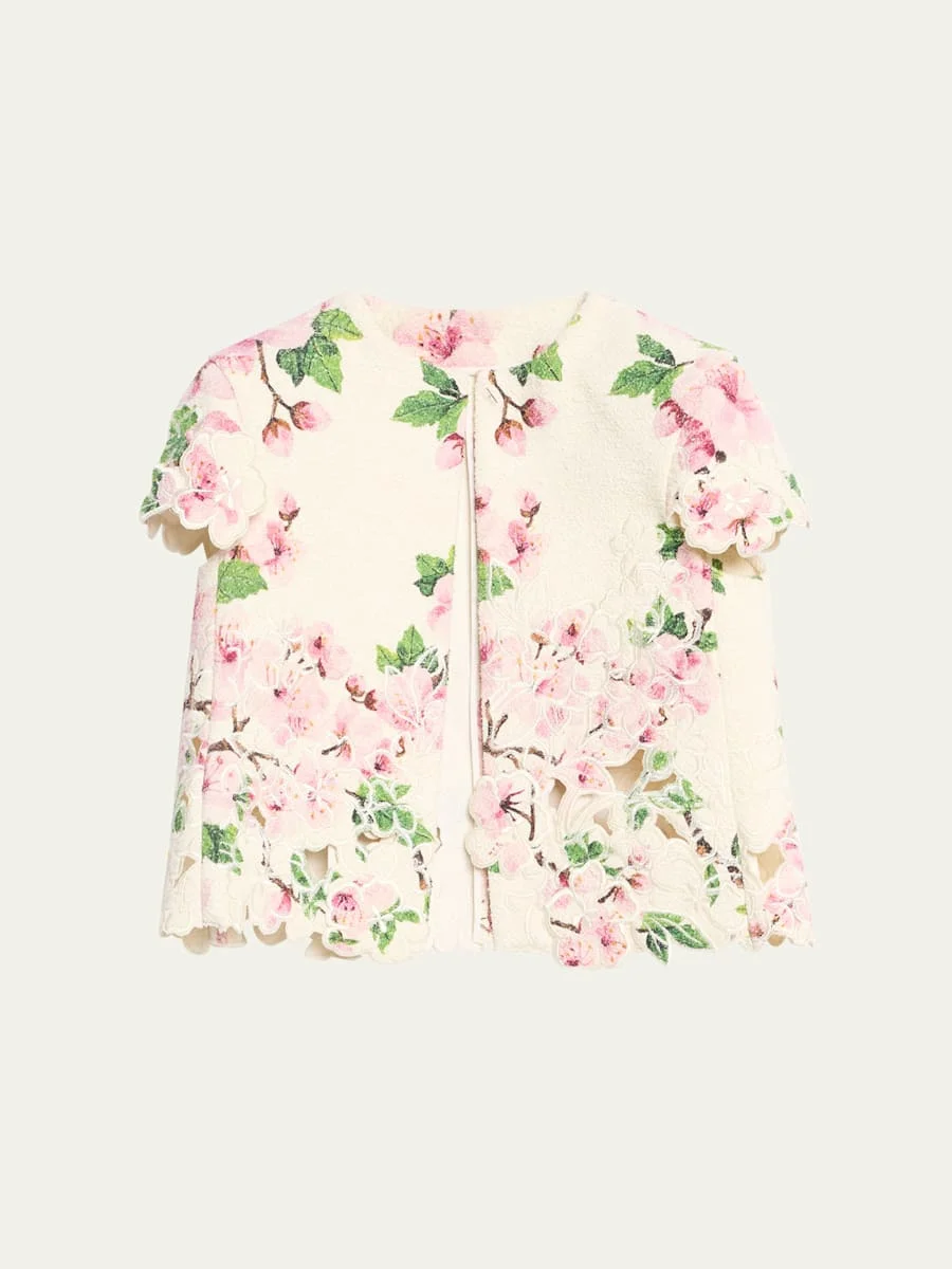 Oscar de la Renta cherry blossom tweed jacket featuring intricate embroidery that enhances its timeless elegance Open neckline Short sleeves Straight fit Cotton/virgin wool/nylon/polyamide Unlined Dry clean Made in Italy Online Inquiries: BGS21_B9XE7| Store Inquiries: #4993455