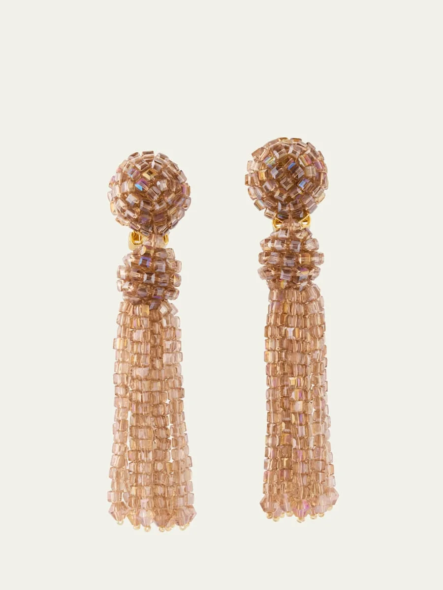Glass beads are strung and gathered for these Oscar de la Renta tassel earrings. Approx. 3.3" length 24karat goldplated brass Glass beads, polyester, and PVC sequins Clipon backs Imported