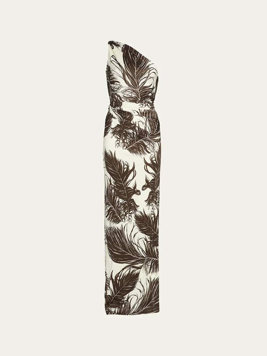 Oscar de la Renta gown crafted in a stretch viscose with a feather print draped along the waist for a figureflattering silhouette Oscar de la Renta's PreSpring 2026 collection celebrates the vibrancy of a garden in full bloom inspired by creative director Laura Kim's own garden, bringing each piece to life on and off the runway. Oneshoulder neckline Sleeveless Bodyskimming silhouette Floor length Side slit hem Side zip closure Viscose/elastane Unlined Dry clean Made in Italy