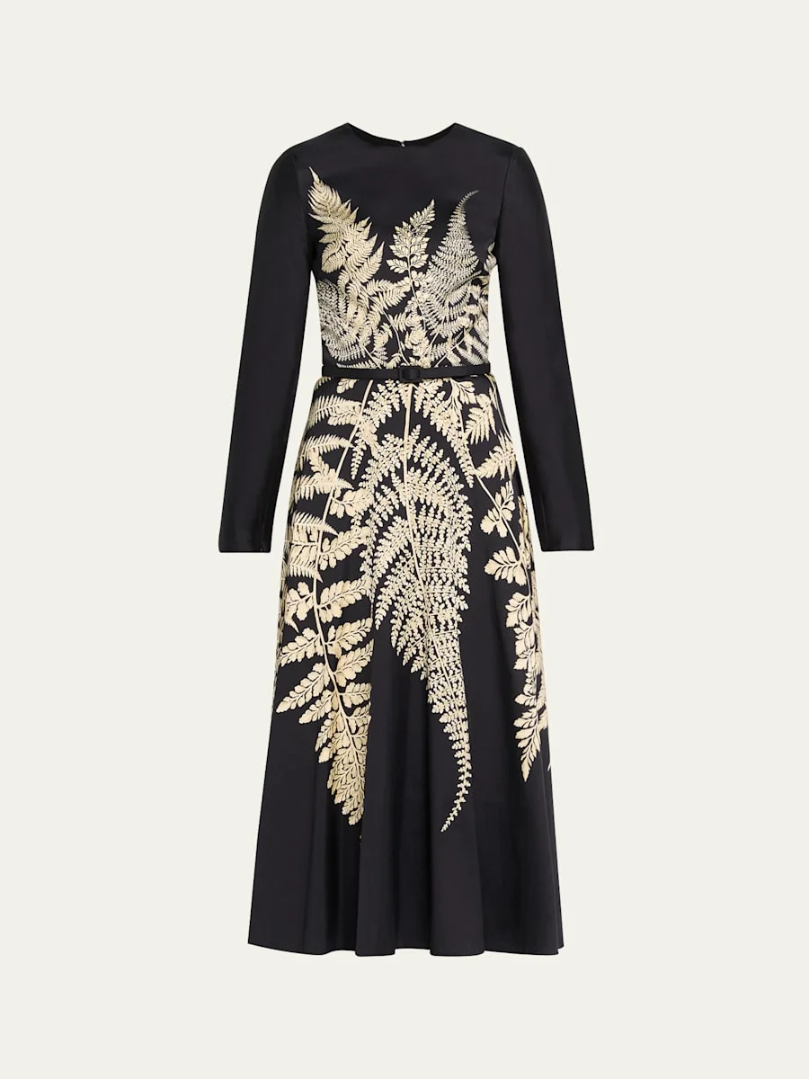 Oscar de la Renta cocktail dress featuring a fern print and a self belt Round neckline Long sleeves Belted waist Aline silhouette Hem falls below the knee Zip closure Cotton/vinyl/silk Lining: Silk Dry clean Made in Italy