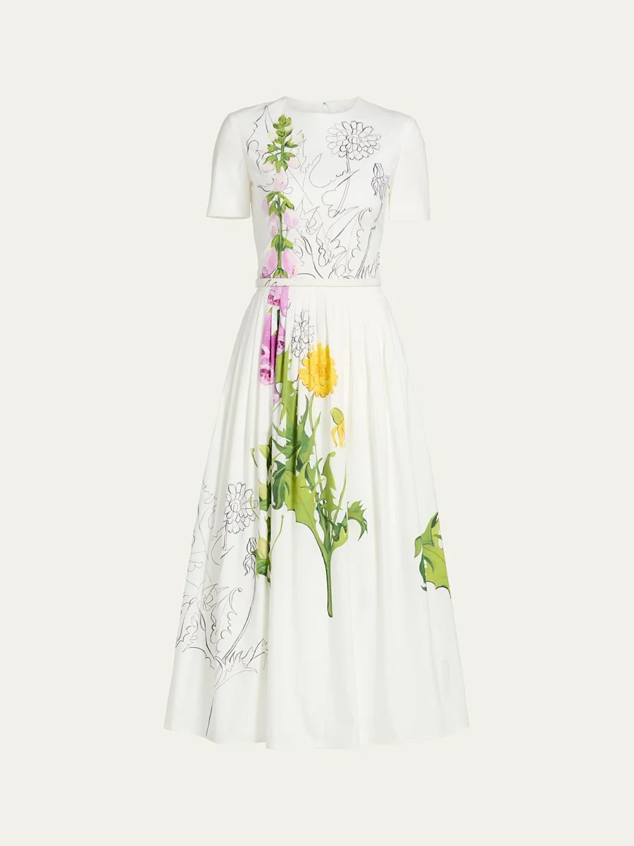 Oscar de la Renta dress crafted of cotton stretch poplin featuring a sketched foxglove and dandelion floral print, a selfbelt, and a pleated skirt Oscar de la Renta's PreSpring 2026 collection celebrates the vibrancy of a garden in full bloom inspired by creative director Laura Kim's own garden, bringing each piece to life on and off the runway. Round neckline Short sleeves Belted waist Side slip pockets Aline silhouette Hem falls below the knee Zip closure Cotton/elastane Lining: Cotton Dry clean Made in Italy