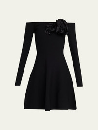 Oscar de la Renta knit dress featuring flower embroidered applique Off-the-shoulder neckline Long sleeves A-line silhouette Mid-thigh length Zip closure Viscose/polyester Dry clean Made in Italy Online Inquiries: BGS21_BA8P3| Store Inquiries: #5043817