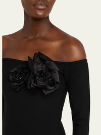 Off-The-Shoulder Flower Applique Long-Sleeve Knit Mini Dress