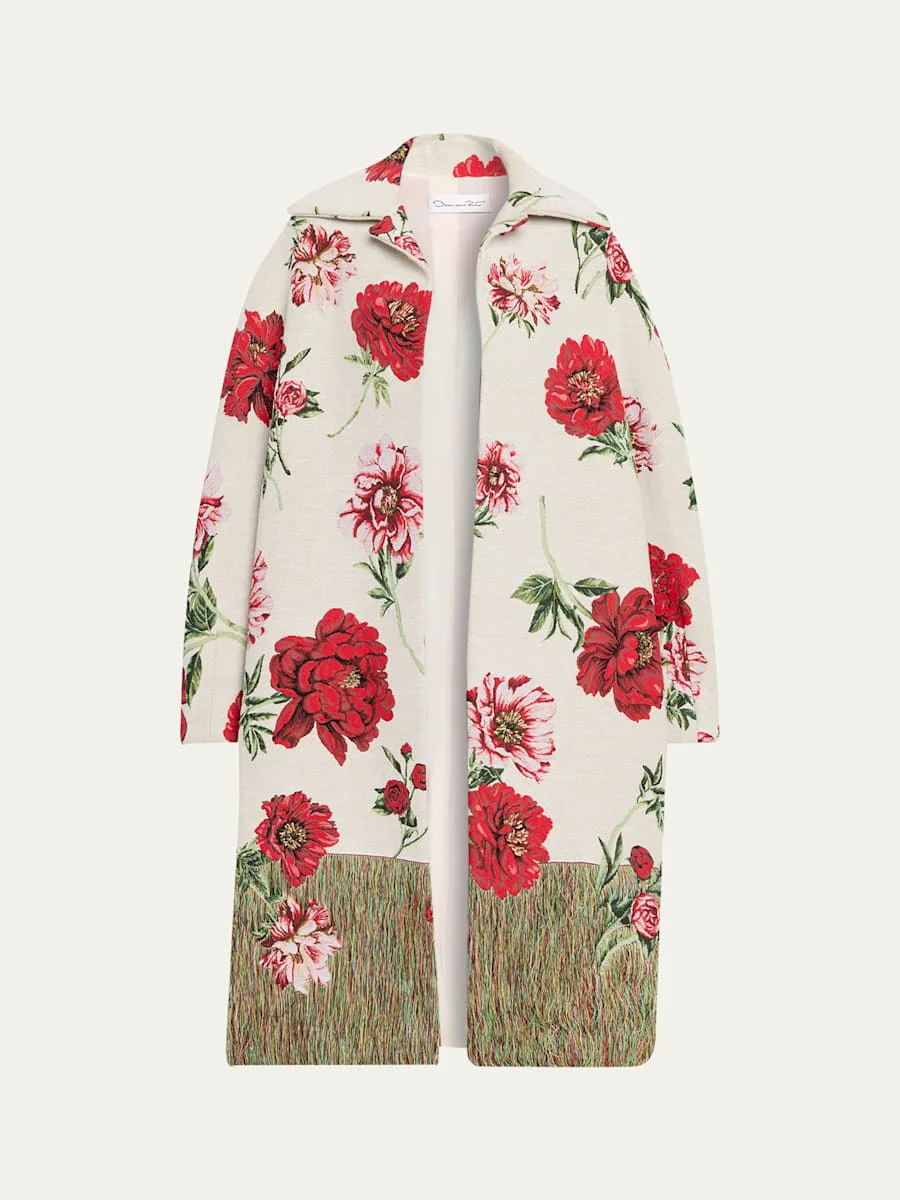 Oscar de la Renta coat in peony jacquard with a fringed hem Spread collar Long sleeves Side split pockets Oversized fit Knee length Hook closure Cotton/polyester/acrylic Dry clean Made in Italy