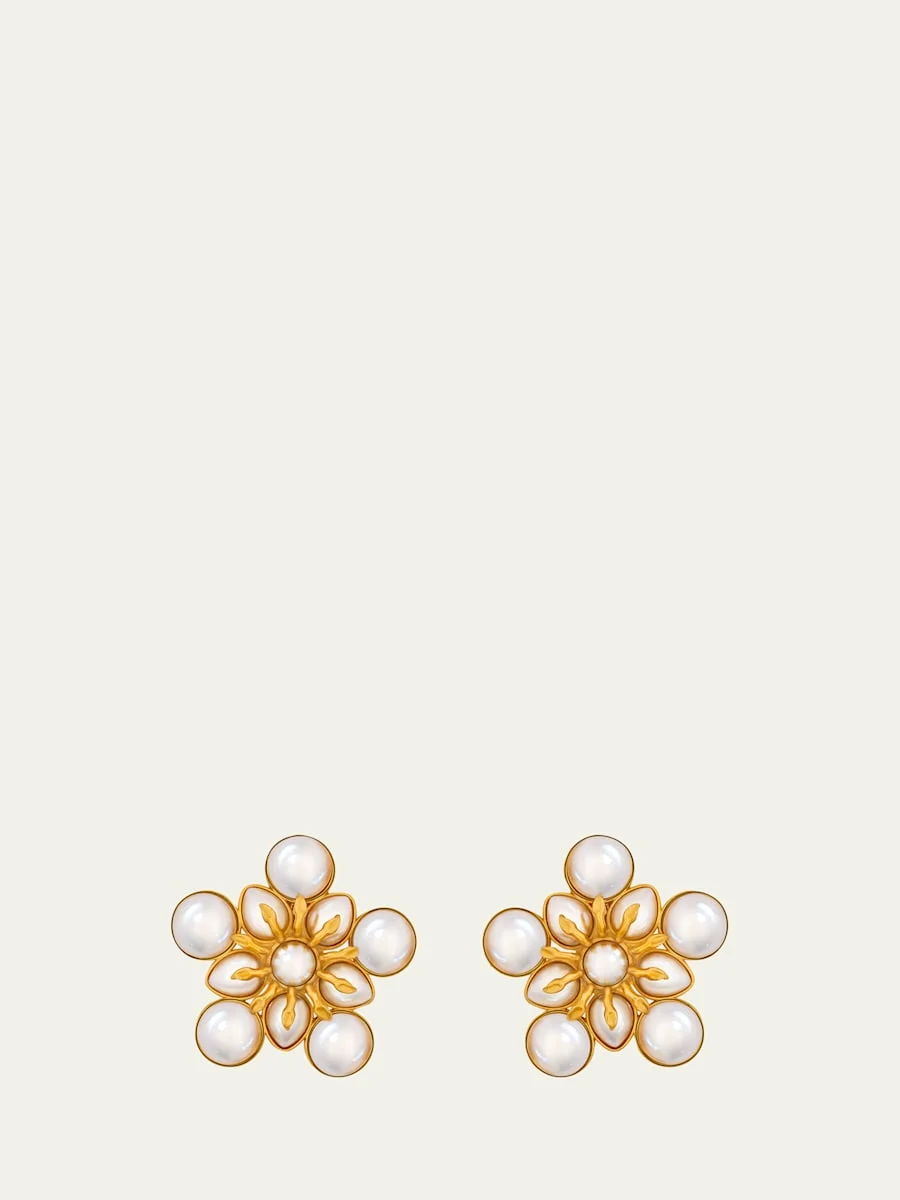 Oscar de la Renta aligns pearlinspired pieces to create a floral silhouette for these button earrings. Approx. 1.37" length x 1.4" width Shiny goldtone brass Plastic cabochons Clipon backs Made in Italy