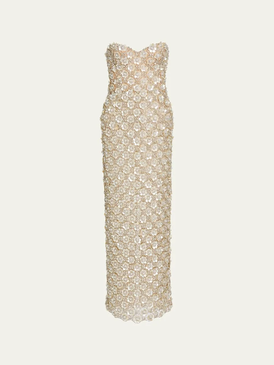Oscar de la Renta gown is delicately embellished with allover pearly and crystal floral embroidery Oscar de la Renta's PreSpring 2026 collection celebrates the vibrancy of a garden in full bloom, inspired by creative director Laura Kim's own garden, bringing each piece to life on and off the runway Sweetheart strapless neckline Sleeveless Column silhouette Full length Walking vent back Invisible back zip Nylon/polyamide/faux pearls Lining: Silk Dry clean Made in USA
