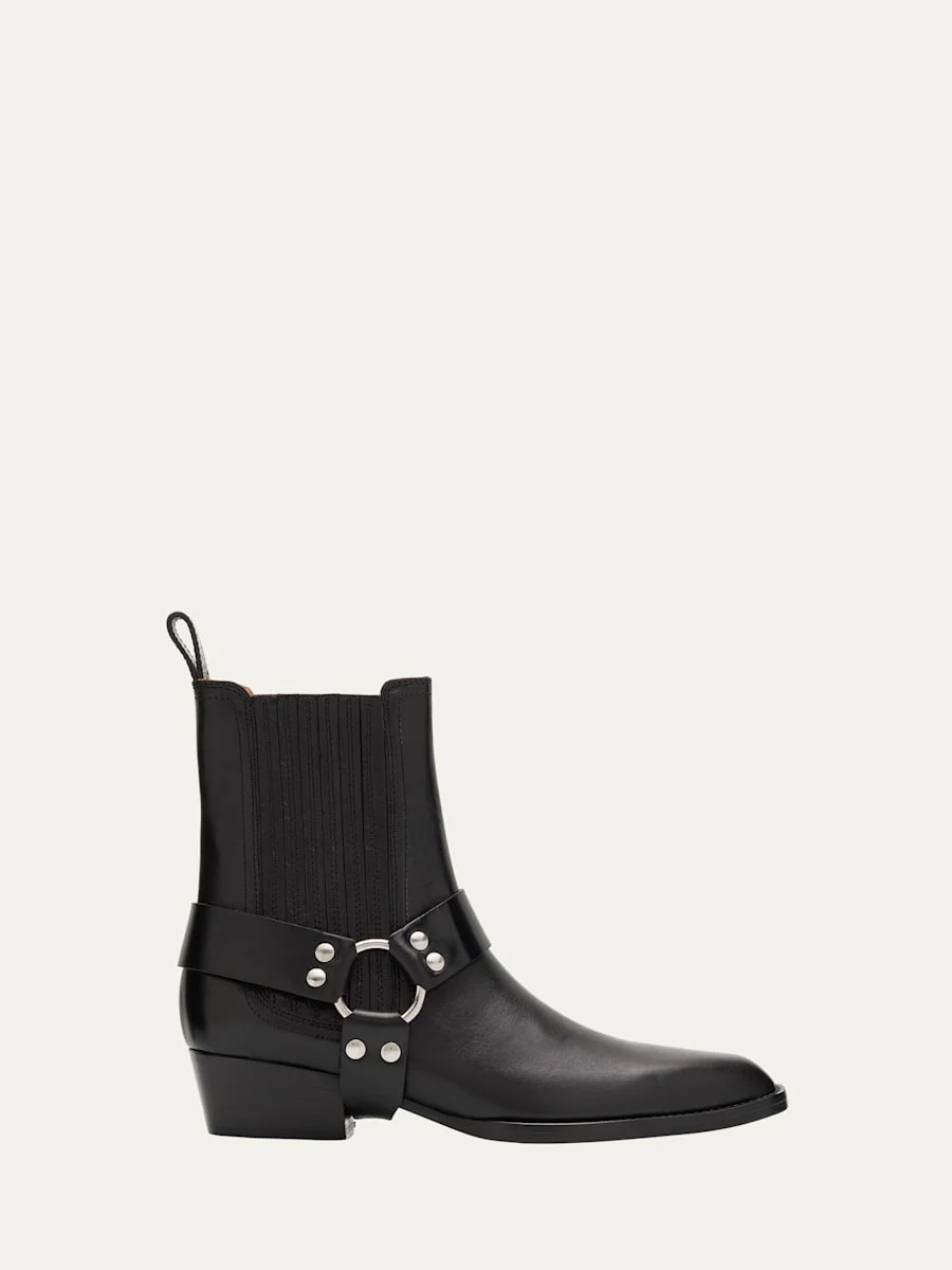 Paris Texas "Helena" ankle boots in smooth calf leather with silver-tone moto harness strap 1.38 in / 35 mm block heel Almond toe Pleated sides Pull-tab at backstay Pull-on style Leather lining and outsole Made in Italy Online Inquiries: BGS21_X6YYC| Store Inquiries: #5063583
