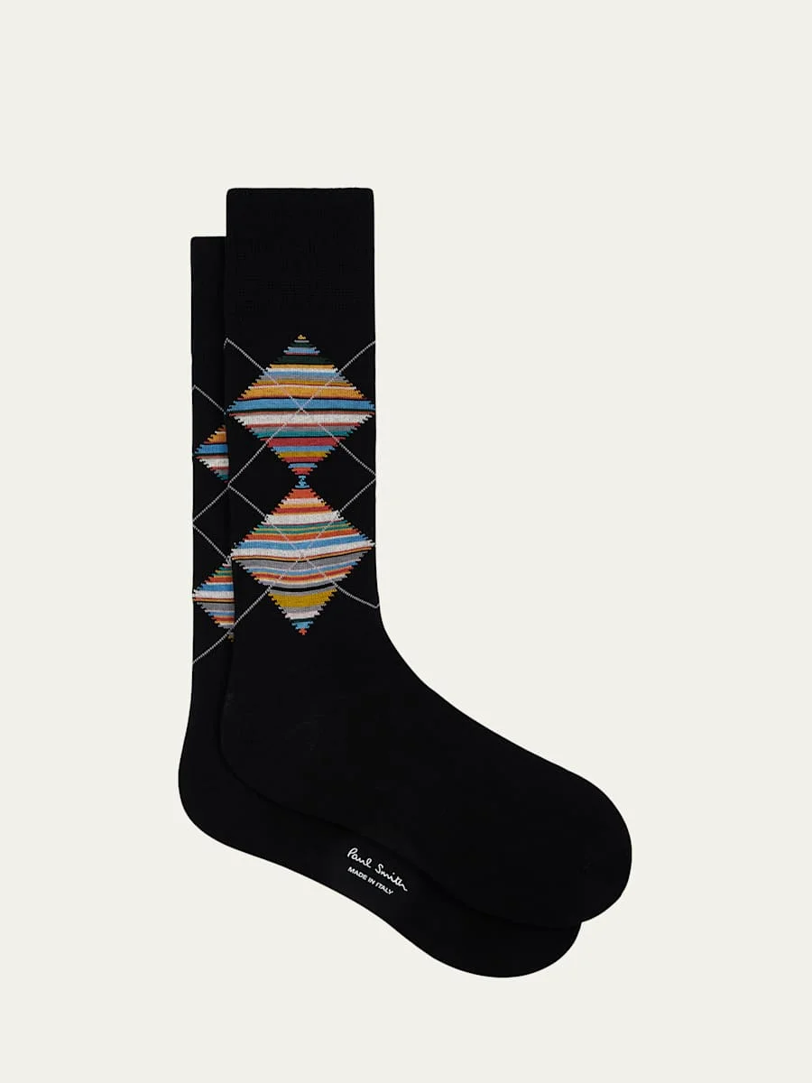 Paul Smith crew socks defined by an argyle motif with the signature stripes for a distinctive touch Ribbed cuffs to prevent slipping Reinforced toe and heel Cotton/nylon/elastane Made in Italy