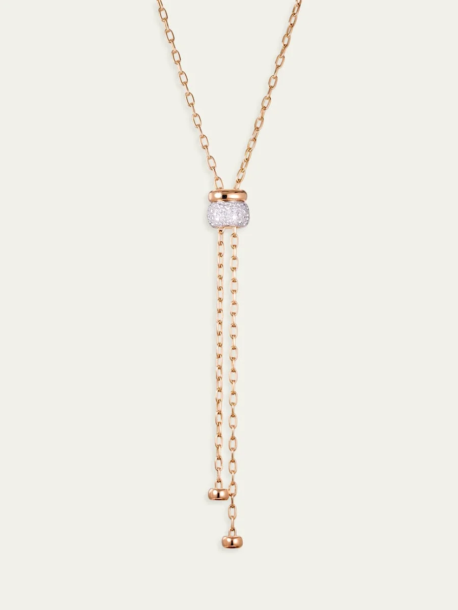 Crafted in warm pink gold and illuminated with sparkling diamonds, this lariat necklace by Pomellato makes a statement with its central motif From the Iconica Collection 18karat rose gold 49 paveset white diamonds 0.80 total diamond carat weight Made in Italy
