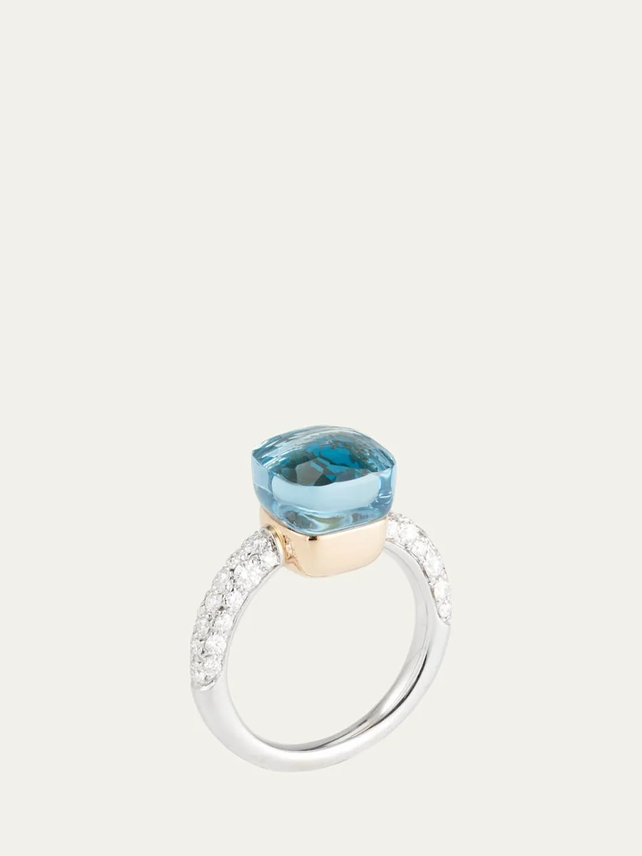 Pomellato petite ring. 18-karat white gold band with diamond pave. Sky blue topaz/agate set in 18-karat rose gold. 6.30 total doublet carat weight. 0.50 total diamond carat weight. Made in Italy. Online Inquiries: BGS21_PFXZP| Store Inquiries: #4076956