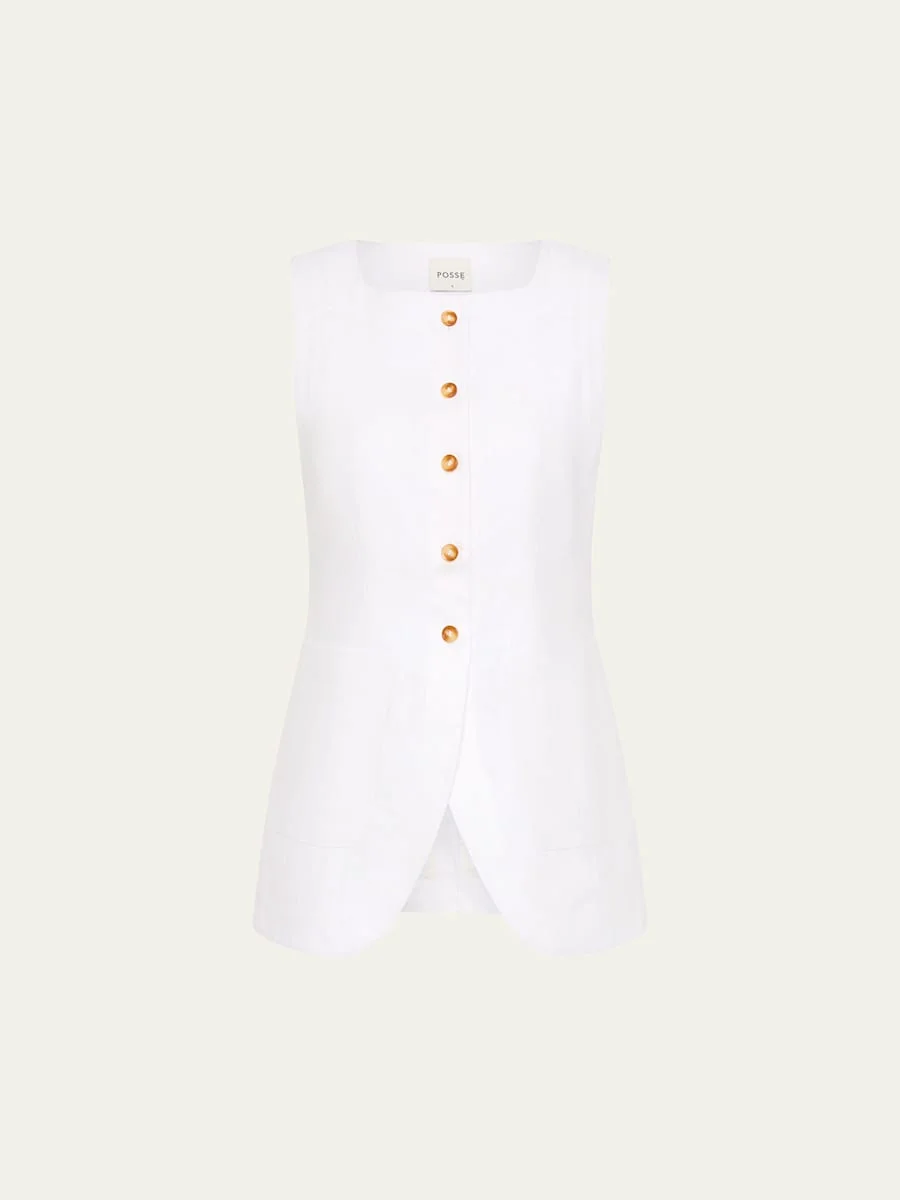 Posse "Emma" vest crafted from pure linen and designed for a close fit Approx. 27.2"L from shoulder to hem Elegant high neckline Sleeveless Hip patch pockets Adjustable back waist tab Center back vent Longline silhouette Flared peplum hem Button front closure Linen Lining: Cotton Imported Online Inquiries: BGS21_T6DZP| Store Inquiries: #4967505