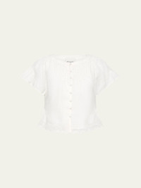 Cut from soft, lightweight ramie, the "Grace" blouse by Posse features an exclusive vintage-inspired scallop lace trim Approx. 20.3"L from shoulder to hem Flattering boat neckline with pintuck detailing Short flutter sleeves; approx. 8.5"L High-low hem Relaxed fit Button front closure Ramie Lining: Cotton Imported Online Inquiries: BGS21_T6E0S| Store Inquiries: #4967640