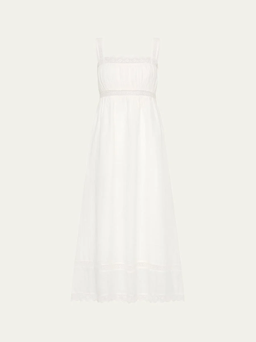 Cut from soft, lightweight ramie, the "Grace" dress by Posse features exclusive vintage-inspired scallop lace trim Approx. 53.5"L from shoulder to hem Square neckline Sleeveless Side seam pockets Full length Full a-line skirt Invisible back zipper Ramie Lining: Cotton Imported Online Inquiries: BGS21_T6E0Q| Store Inquiries: #4967638