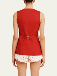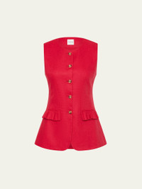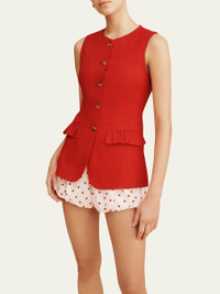 Posse "Matilda" gilet features a ruffle pocket flap that can be worn out for added flair or concealed for a streamlined look Approx. 27"L from shoulder to hem Jewel neckline Sleeveless Functional front welt pockets Back adjustable buckle to customize the fit Longline silhouette Flared peplum hem Button front closure Linen Lining: Cotton Imported Online Inquiries: BGS21_T6DZK| Store Inquiries: #4967488