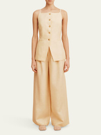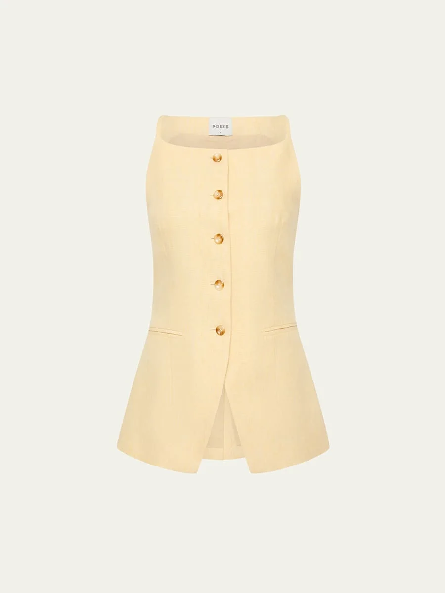 Crafted from pure linen, the "Nancy" gilet by Posse features an adjustable buckle at the back for a tailored fit Approx. 26"L from shoulder to hem Elegant high boat neckline Sleeveless Side besom pockets Hip length Tailored fit Button front closure Linen Lining: Cotton Imported Online Inquiries: BGS21_T6E0P| Store Inquiries: #4967637