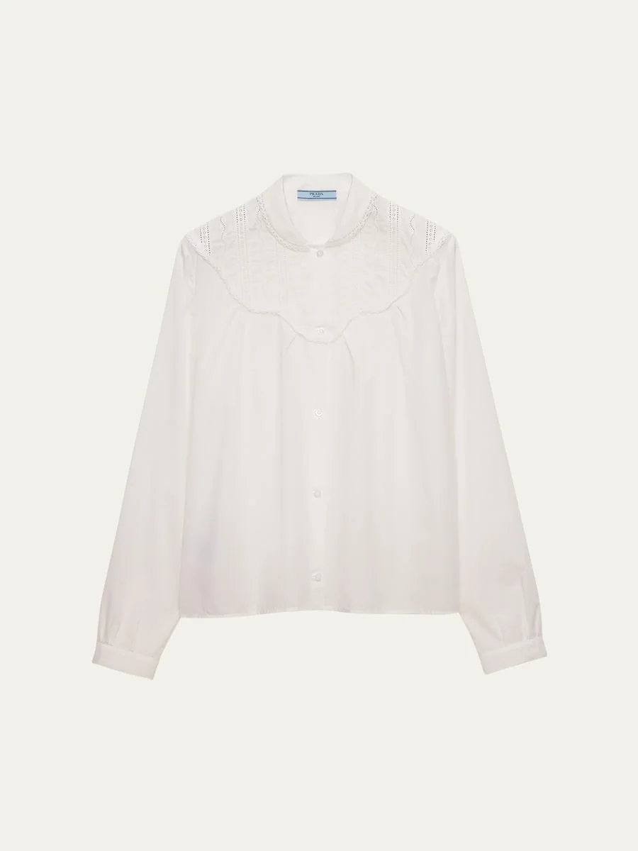 Vintage charm enhances this Prada light batiste shirt, defined by soft lines and romantic embroidery for an effortlessly feminine look Fabric triangle logo Rounded collar Front button closure Long sleeves Straight fit Cotton Dry clean, professional cleaning recommended Made in Italy Online Inquiries: BGS21_BA57X| Store Inquiries: #5039061
