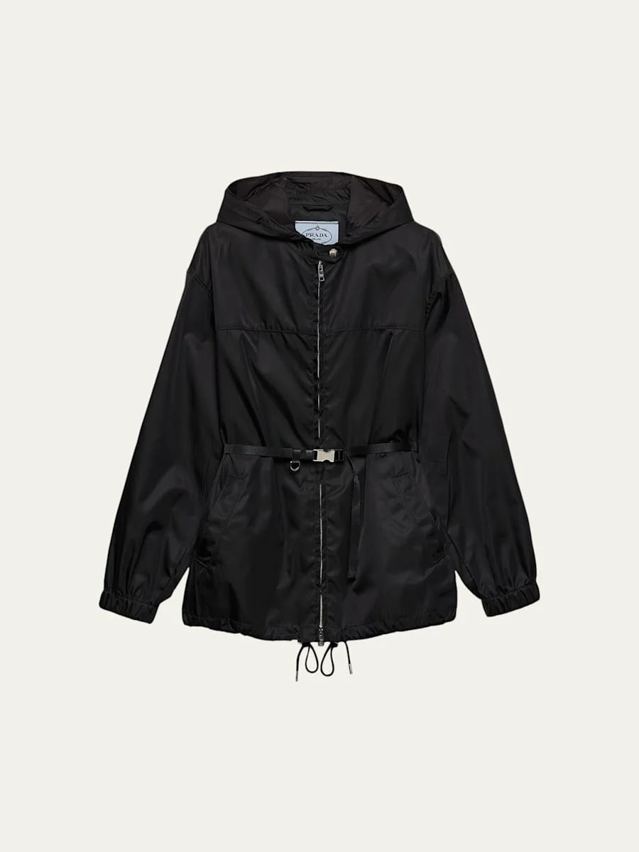 Crafted from innovative technical ReNylon, this blouson jacket from Prada features sporty details like a grosgrain belt cinched waist with a logoengraved silvertone buckle Hooded neckline; twoway zip front Long sleeves; elasticized cuffs Belted waist Hip welt pockets Oversized fit Hem falls below the hip Drawcord cinched hem Nylon/polyamide Dry clean Made in Italy
