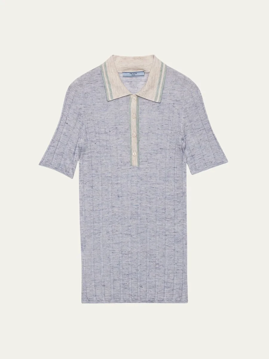 Crafted from cashmeresilk wide ribbed knit, this polo shirt from Prada features contrast striped collar nad placket Spread collar; fourbutton front Short sleeves Fitted Hip length Ribbed cuffs and hem Pullover style Cashmere/silk Dry clean Made in Romania SIZE amp; FITModel measurements: 5'10" tall Model is wearing a US size 4/Small