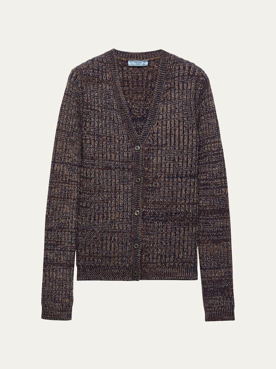 Prada cardigan in a mouline rib knit Features a signature fabric triangle patch on the back V neckline; button front Long sleeves Relaxed fit Ribbed cuffs and hem Virgin wool/cashmere Dry clean Made in Italy Online Inquiries: BGS21_BA9PQ| Store Inquiries: #5063755