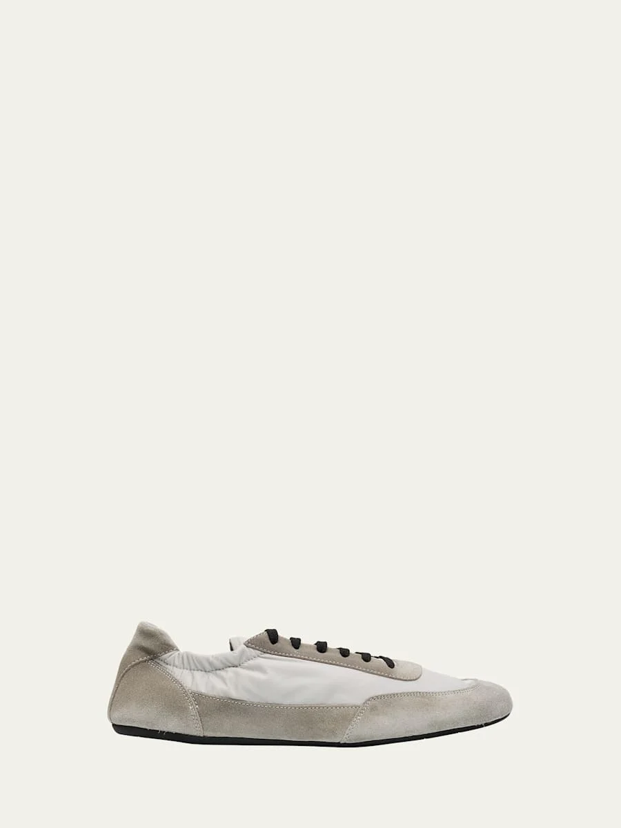 Prada lowtop sneakers in suede, nylon, and polyester 0.17 in / 5 mm flat heel Round toe Laceup vamp Rubber outsole Professional cleaning recommended, spot clean Made in Italy