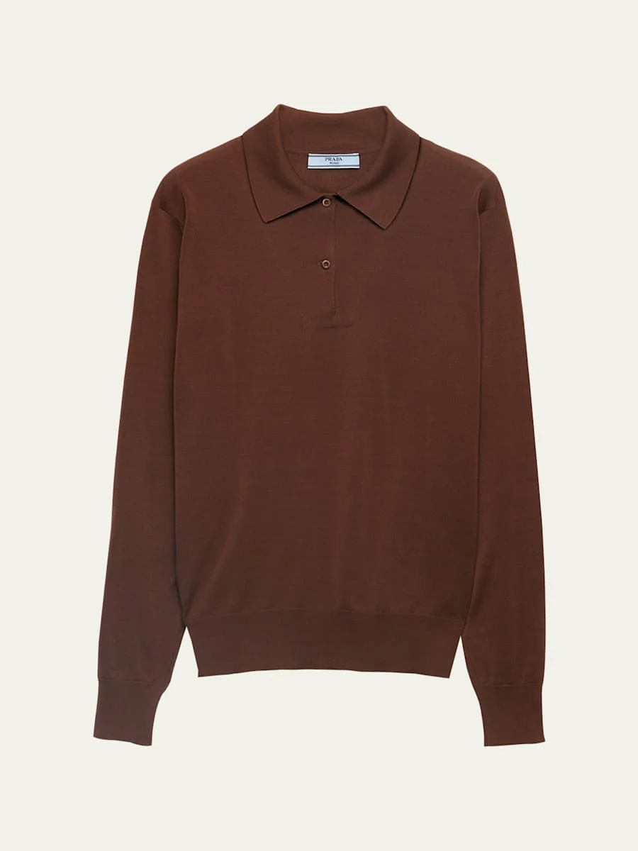 Prada polo sweater Spread collar; two-button front Long sleeves Relaxed fit Ribbed cuffs and hem Pullover style Cotton Dry clean, professional cleaning recommended Made in Italy Online Inquiries: BGS21_BA579| Store Inquiries: #5039039