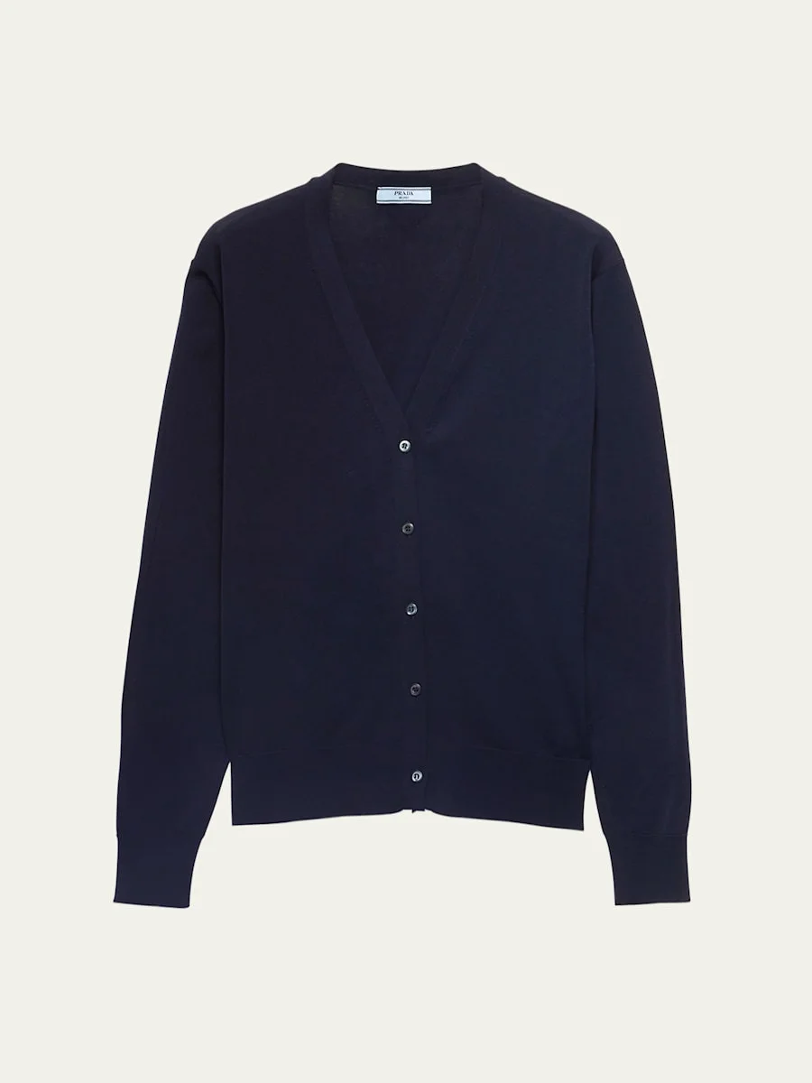 Prada cardigan with signature triangle patch on the back V neck; button front Long sleeves Relaxed fit Ribbed cuffs and hem Cotton Dry clean, professional cleaning recommended Made in Italy Online Inquiries: BGS21_BA587| Store Inquiries: #5039071