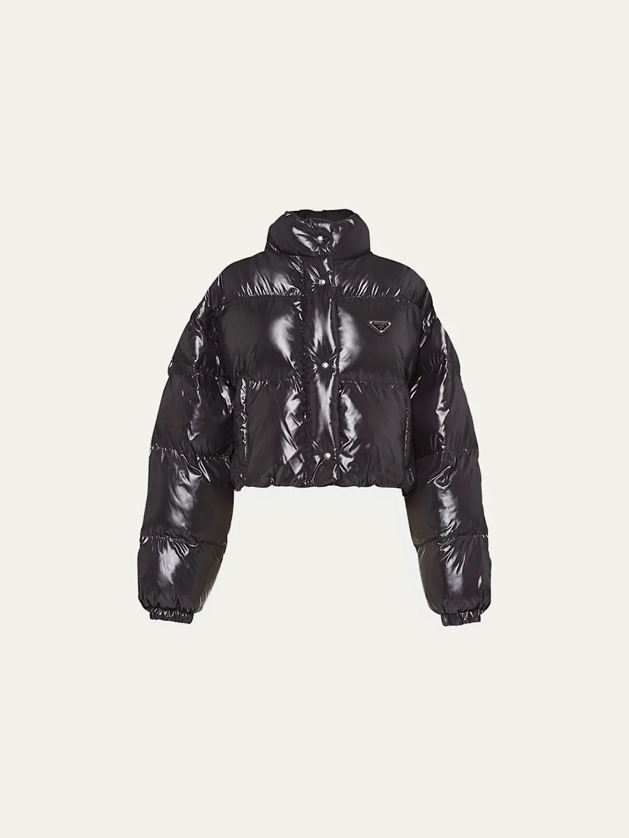 Prada quiled down jacket with enameled metal triangle logo on chest Stand collar; zip front Long sleeves; elastic cuffs Side slip pockets Semifitted Cropped length Drawstring hem Recycled nylon self/lining Polyester/down/feather filling Dry clean, professional cleaning recommended Made in Romania