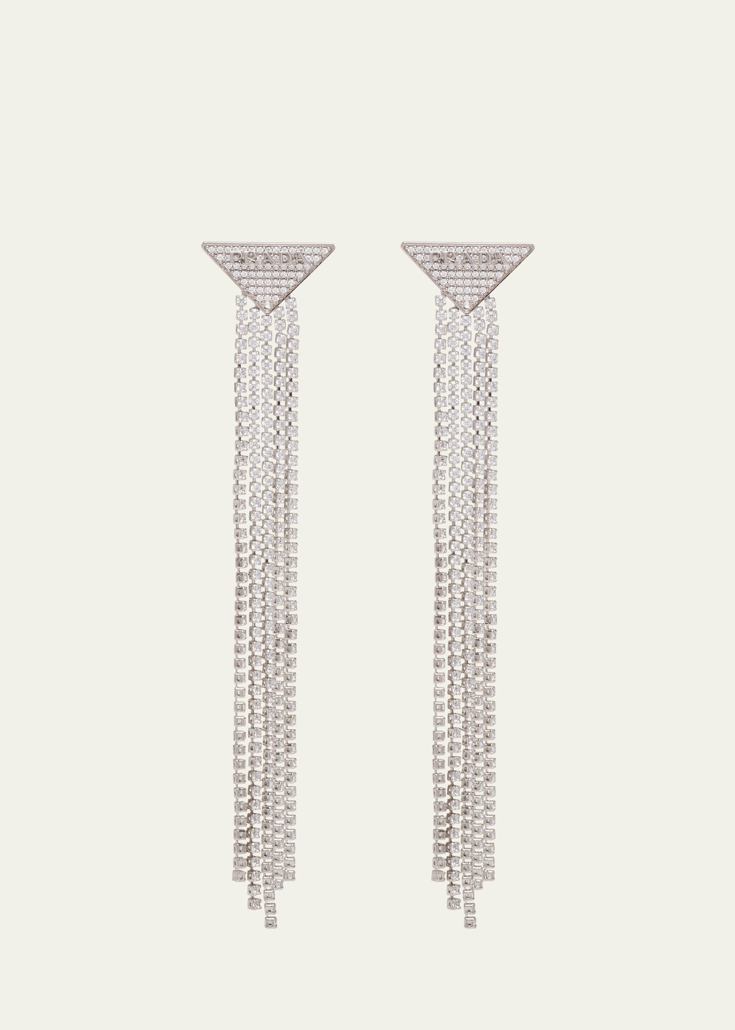 The triangle illuminated with zircons defines these Prada pendant earrings, combined with a cascade of fringe embellished with zircons. The iconic and sleek geometric detail is the protagonist of a jewelry line made of 925 sterling silver. 925 sterling silver with zircons palladium finish Hypoallergenic and nickel-free materials For pierced ears Made in Italy Online Inquiries: BGS21_Y5QUX| Store Inquiries: #4179612