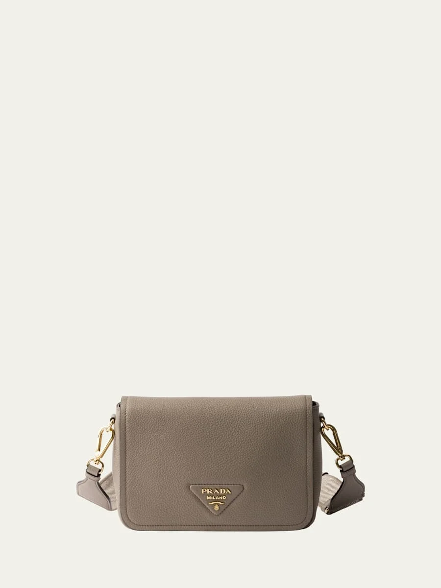 Prada "Daino" soft grainy leather crossbody bag with signature triangle logo Detachable, adjustable web crossbody strap Flap top with magnetic closure Exterior, back slip pocket Interior, one zip pocket Monogram lining Approx. 5.5"H x 10.2"W x 3.7"D Made in Italy