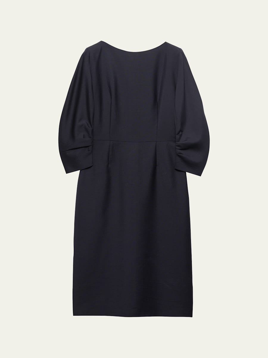 Prada's mohair and wool suiting dress embodies sophisticated minimalism, featuring a classic boat neckline and structured tailoring defined by front and back darts. Bateau neckline Long sleeves Pintucked back hem Midi length Sheath silhouette Back button fly Mohair/wool Dry clean Made in Italy SIZE amp; FITModel measurements: 5'10" tall Model is wearing a US size 4/Small