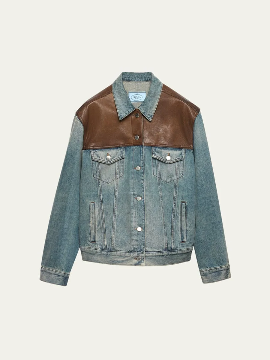 Prada denim jacket is elevated with leather shoulder panels Spread collar; button closure Long sleeves; button cuffs Chest flap pockets; side pockets Straight fit Cotton Dry clean, professional cleaning recommended Made in Romania Online Inquiries: BGS21_BA57V| Store Inquiries: #5039059