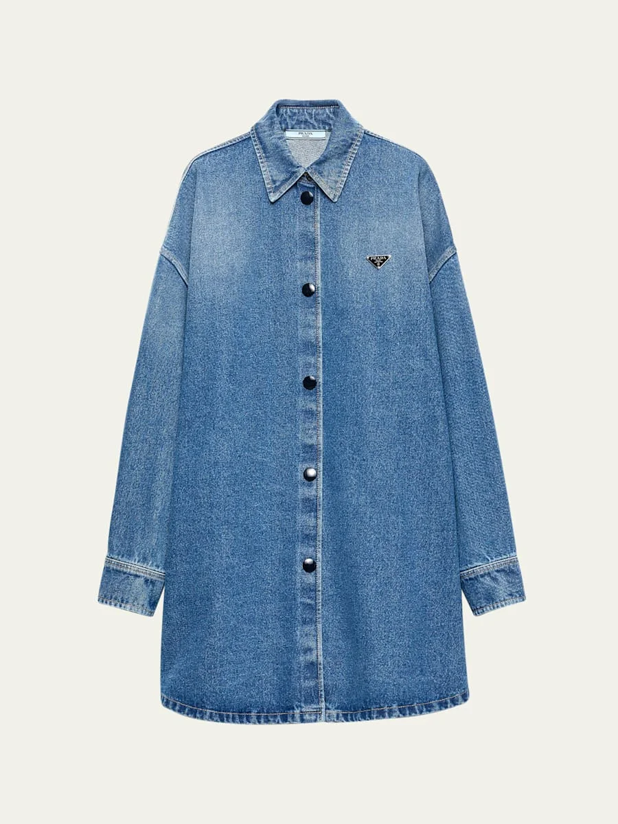 Prada shirt in faded medium wash denim with an enameled metal triangle logo on the chest Point collar; snap-button front Long sleeves; snap barrel cuffs Oversized fit Tunic length Shirttail hem Cotton Dry clean Made in Romania Online Inquiries: BGS21_BA9QL| Store Inquiries: #5063785