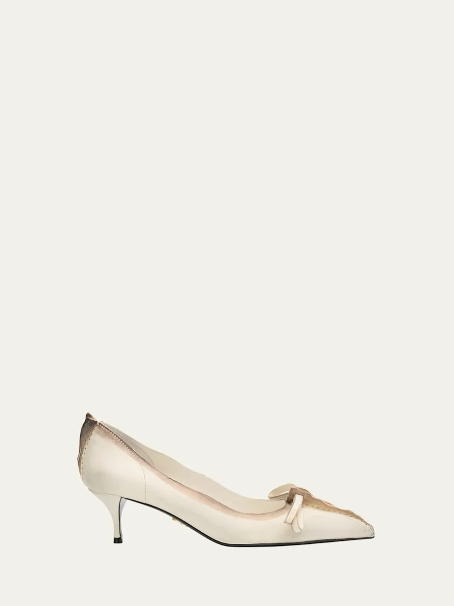 Crafted from distressed leather, these pumps by Prada are defined by a center seam detail and dainty bow accent 2.25 in / 55 mm covered kitten heel Pointed toe Slipon style Leather lining Rubber outsole Professional cleaning recommended Made in Italy