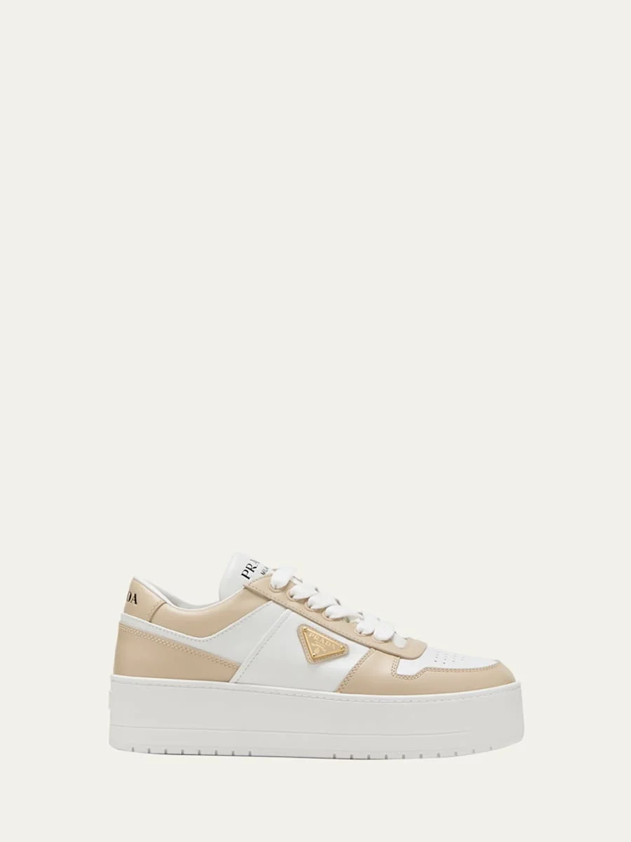 Prada "Downtown" low-top two-tone leather platform sneakers Signature logo triangle accent 2.00 in / 50 mm flat heel Round toe Lace-up vamp Cushioned footbed Rubber outsole Professional cleaning recommended, spot clean Made in Italy Online Inquiries: BGS21_X6L73| Store Inquiries: #4794523