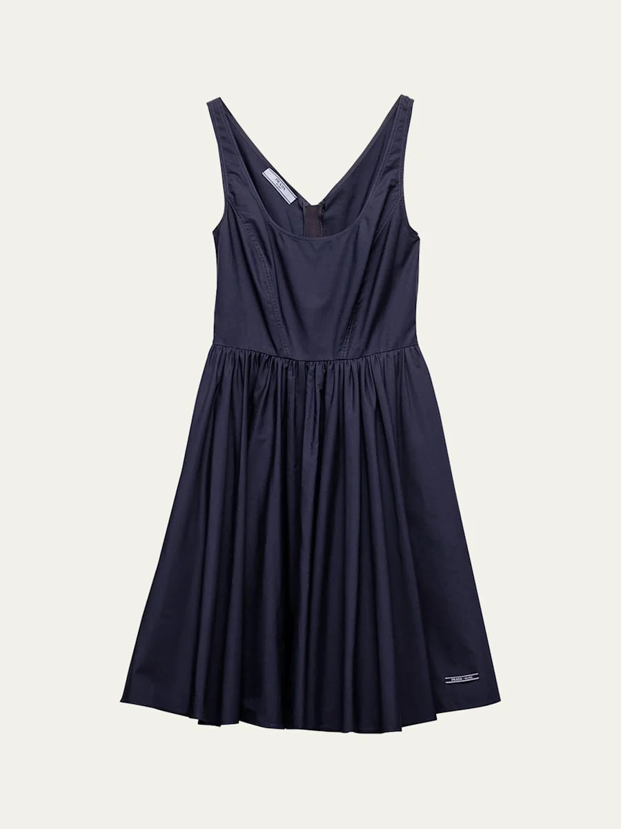 Prada dress featuring a pleated skirt with printed typography detailing along the hem Scoop neckline Sleeveless Fitandflare silhouette Hem falls above the knee Back zip Cotton Dry clean, professional cleaning recommended Made in Italy