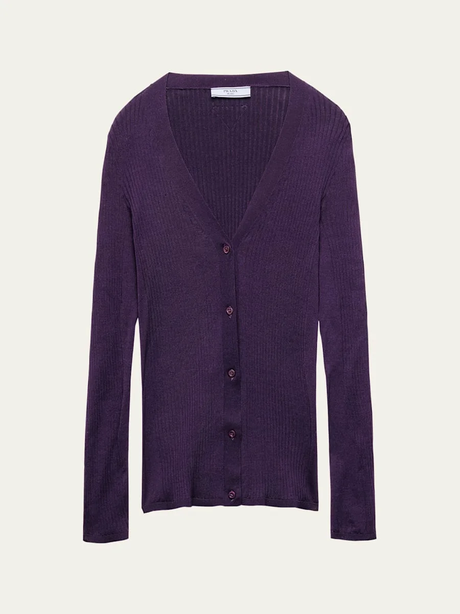 Prada ribknit cardigan featuring a sartorial label and a fabric triangle logo on the back V neckline; button front Long sleeves Fitted Cotton Dry clean, professional cleaning recommended Made in Italy