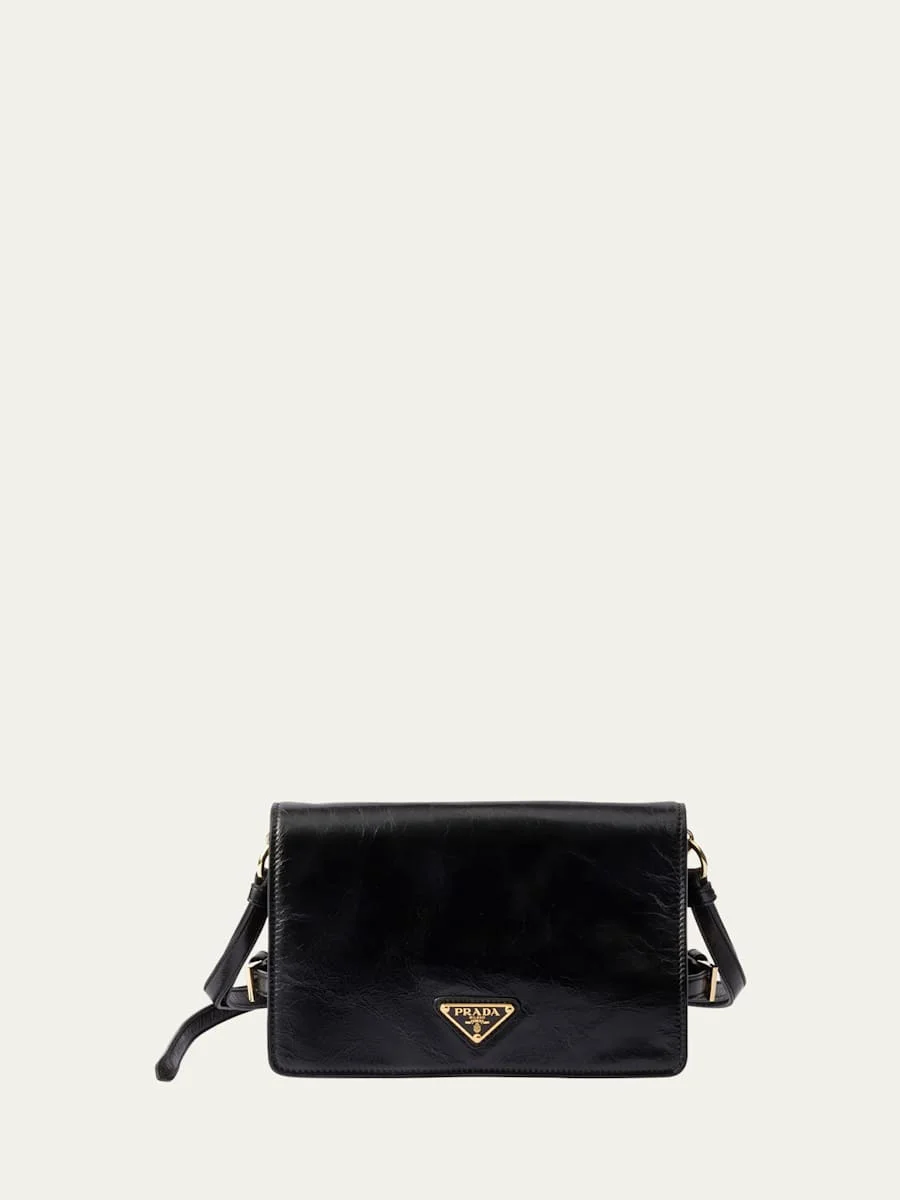 Prada shoulder bag in soft lux leather Adjustable shoulder strap Flap top with magnetic closure Exterior, back zip pocket Divided interior Lining: Nylon Approx. 5.1"H x 8.7"W x 3.1"D Made in Italy Online Inquiries: BGS21_V6P40| Store Inquiries: #4911297