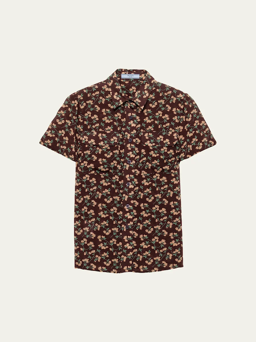 Prada luxurious silk georgette blouse adorned with a floral print Signature logo patch on the back Point collar Short sleeves Dual chest pockets Classic fit Hem falls to the hip Button-front Silk/elastane Dry clean Made in Italy Online Inquiries: BGS21_BAC5U| Store Inquiries: #5079524