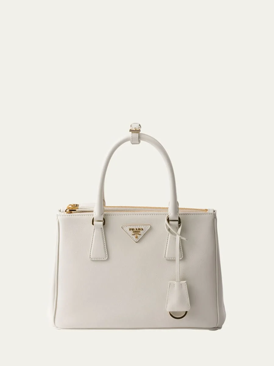 Prada "Galleria" grainy leather top handle bag with signature triangle logo Rolled top handles with belt strap; keyring tag Open top with side snap closures Interior, double zip compartments, one zip pocket Approx. 7.7"H x 11"W x 4.7"D Made in Italy