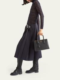 Prada "Galleria" grainy leather top handle bag with signature triangle logo Rolled top handles with belt strap; keyring tag Open top with side snap closures Interior, double zip compartments, one zip pocket Approx. 7.7"H x 11"W x 4.7"D Made in Italy