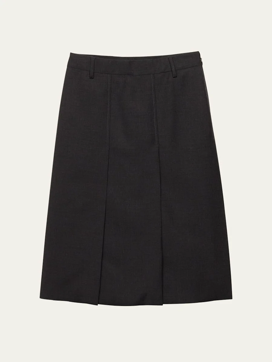 Prada Grisaglia check skirt finished with pleated slits panels Mid waist Knee length Aline silhouette Side zip; belt loops Virgin wool Dry clean Made in Italy