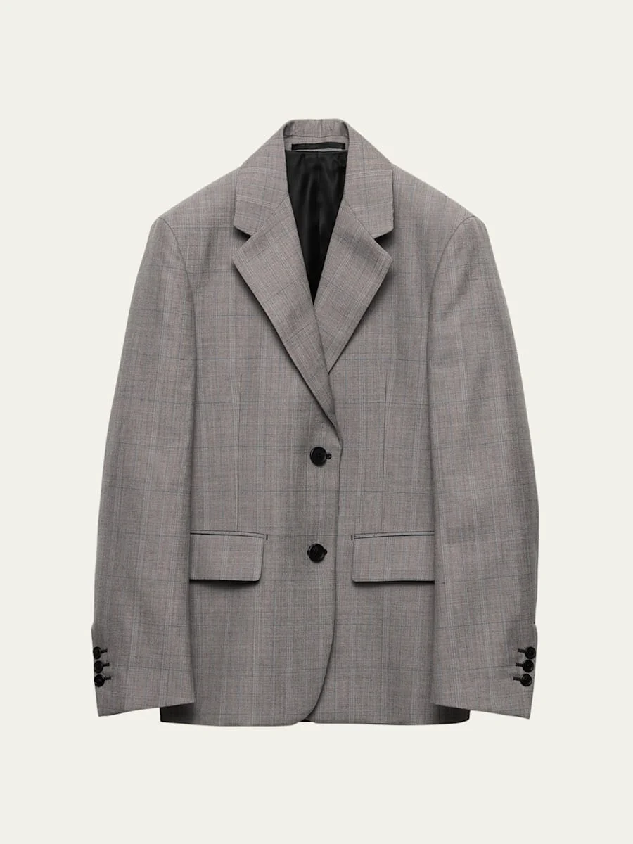 Prada blazer jacket in a grisaglia check wool with contrast buttons Notch lapels; singlebreasted front Long sleeves; button cuffs Padded shoulders Hip flap pockets Straight fit Walking vent back Virgin wool Dry clean Made in Italy
