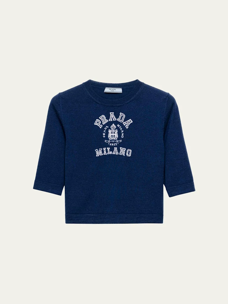 Prada knit sweater in collegiate style, featuring a bold contrast intarsia logo across the chest Crew neckline Short sleeves Boxy fit Pullover style Cashmere Dry clean, professional cleaning recommended Made in Italy