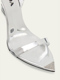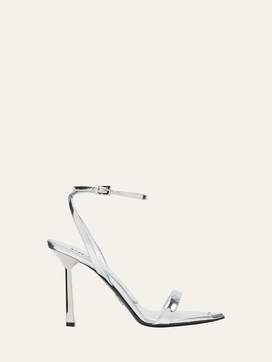 Prada sandals in metallic leather with an extended metal toe with enameled triangle logo hardware 4.00 in / 100 mm stiletto heel Pointed toe Buckle ankle strap Leather lining Rubber outsole Professional cleaning recommended Made in Italy
