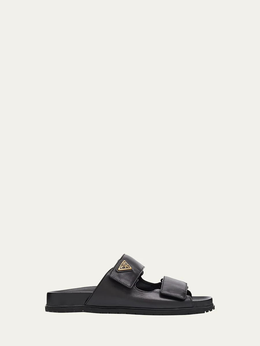 Prada calf leather easy sandals with signature logo triangle accent 0.75 in / 20 mm flat heel Open toe Dual adjustable grip straps Slide style Molded comfort footbed Rubber outsole Made in Italy